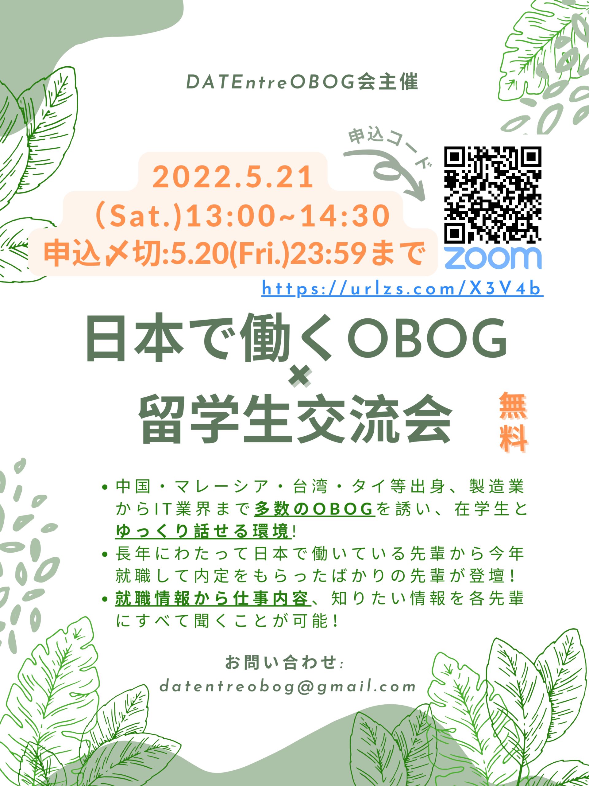 新入生を歓迎するために、5月21日の13:00~14:30に2022年度の一回目のOBOG交流会を開催する予定です!OBOGだけではなく、在学生もぜひ積極的に参加してください~Onlineで開催するので、日本国内外からのご参加を心よりお待ちしております!