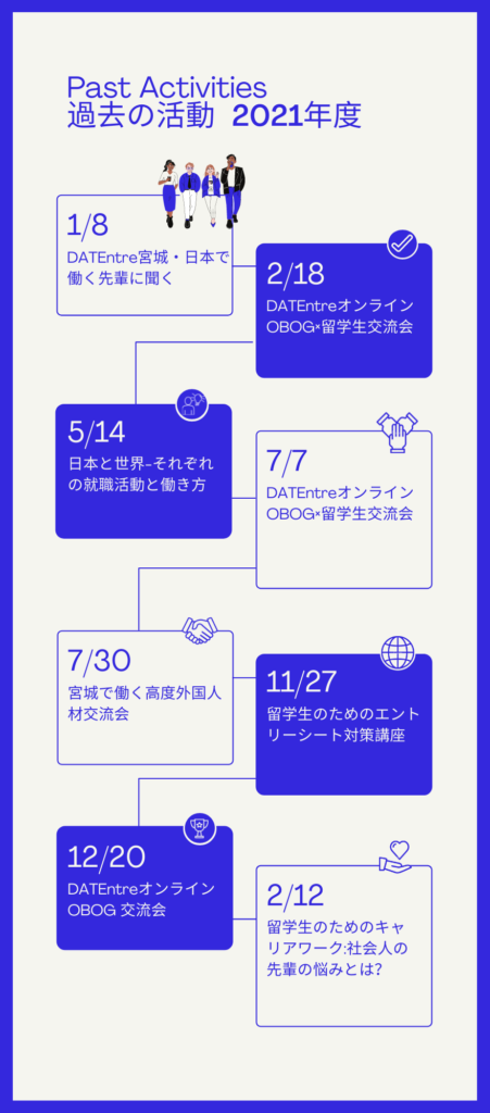 過去には、就職準備セミナー、社会人先輩の話を聞ける交流会等のイベントを開催してきました。(詳細は下記の写真にてご確認)日本で働く上で必要な情報はここでゲットすることができます。日本で就職するかどうかと悩んでいる方でもぜひご参加してみてください!